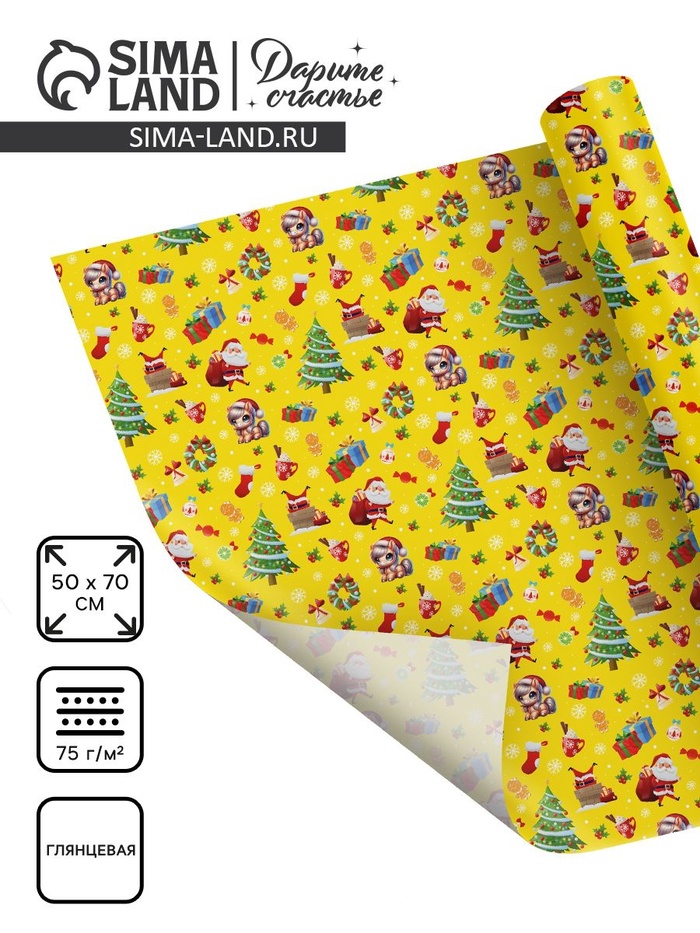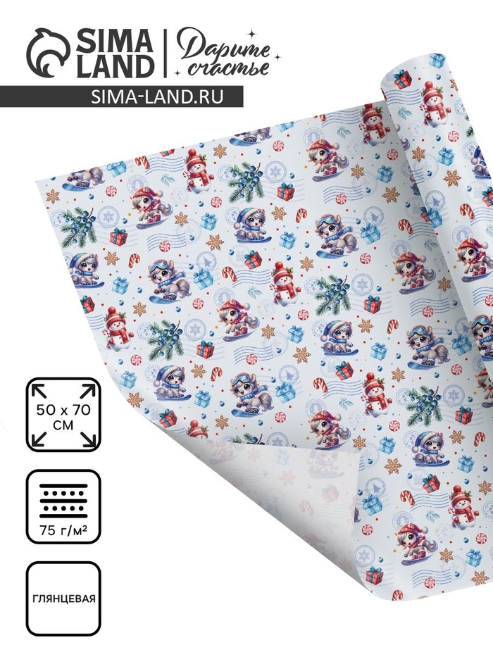 Бумага упаковочная глянцевая «Коняшка и дед Мороз», 50×70 см