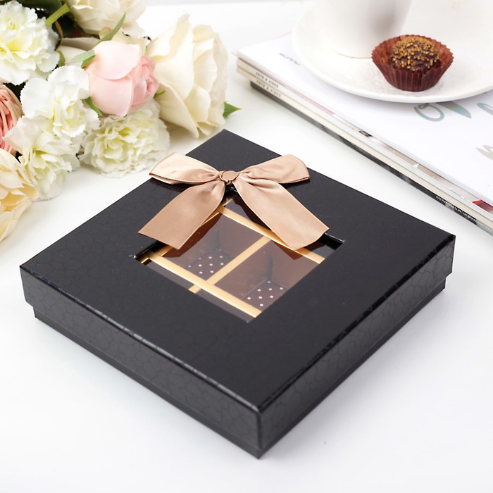 Коробка подарочная с бантом, ручками и прозрачной крышкой 35×21×15 см Черная
