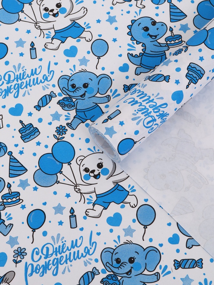 Бумага упаковочная крафт "С днём рождения!", белый/синий, 0,7 х 10± 5% м, 60 гр