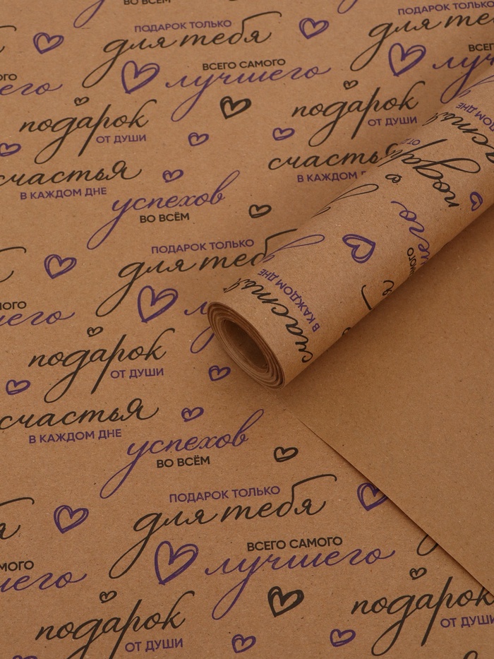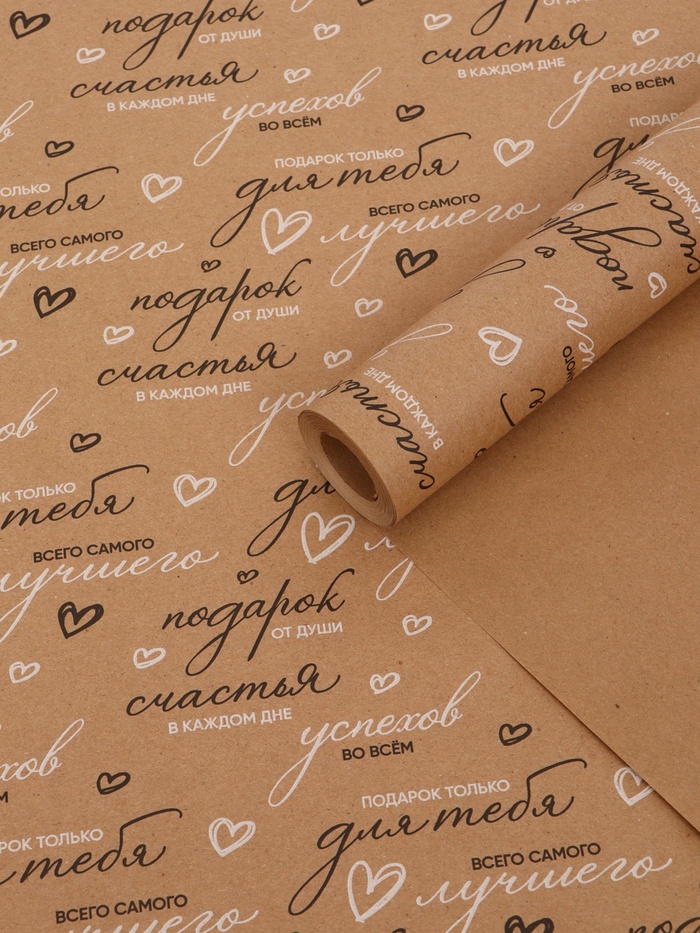 Бумага упаковочная крафт белый "Пожелания", черный/розовый, 0,7 х 10± 5% м, 60 гр