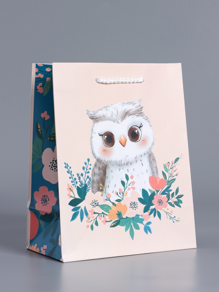 Пакет подарочный ламинированный «Мудрая совушка», бежевый - бирюзовый, 18×22.3×10 см