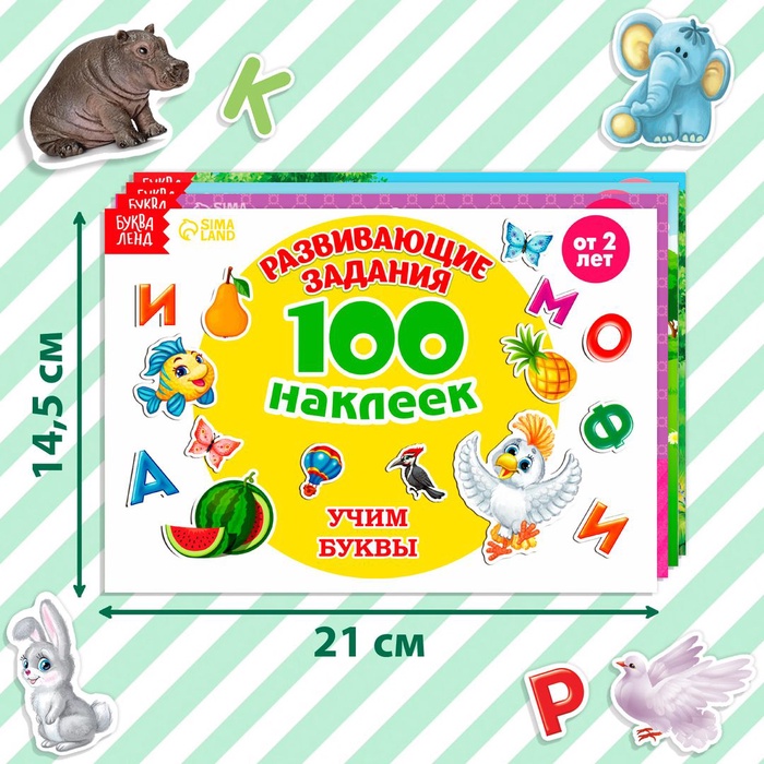 В каждом альбоме представлено 100 наклеек с красочными изображениями животных, растений, букв, фруктов, овощей и других важных предметов окружающего мира. Яркие картинки положительно влияют на визуальное восприятие малыша, память и воображение.