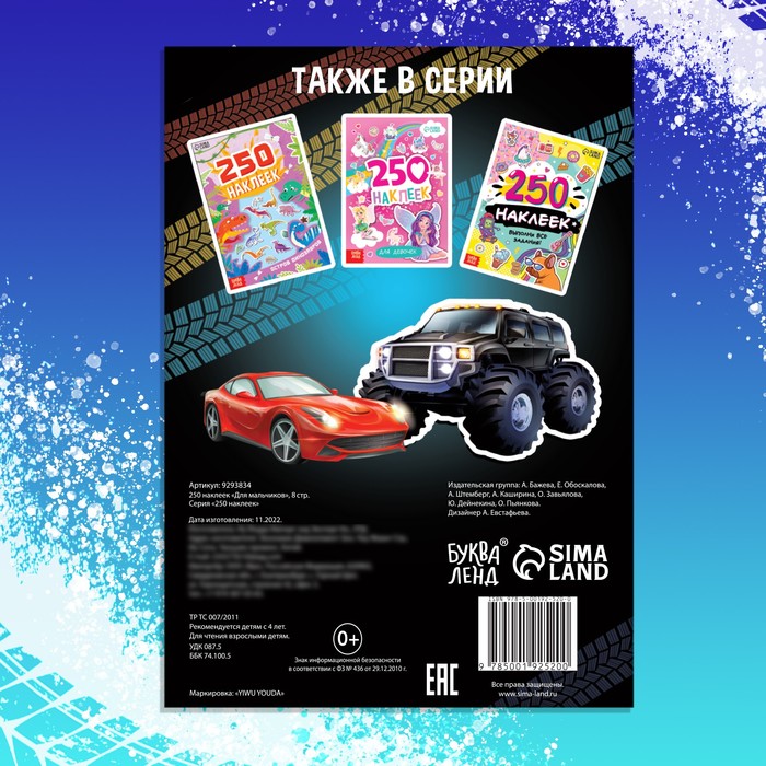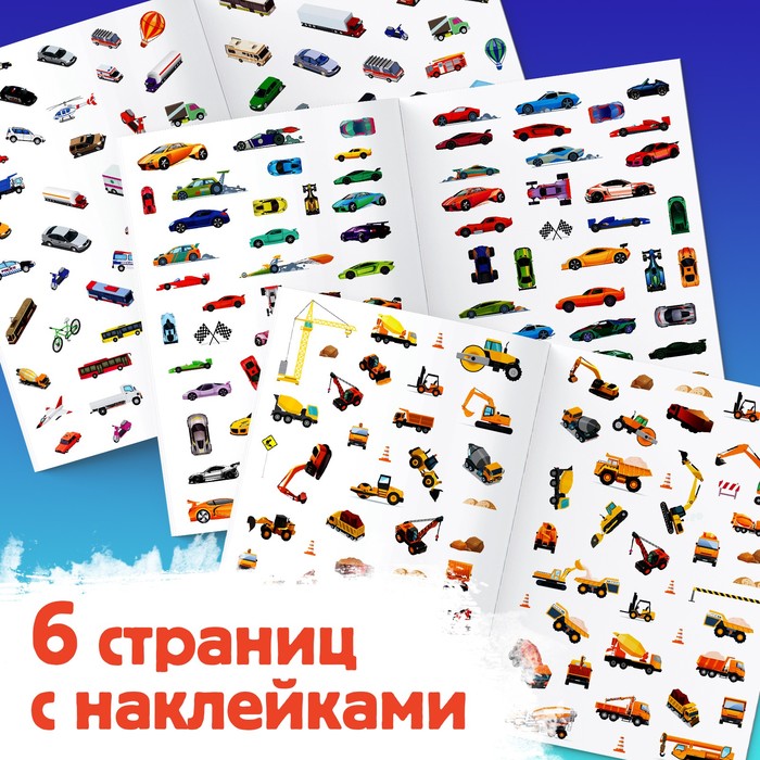 В альбоме представлено 250 стикеров с красочными изображениями транспорта и строительной техники.