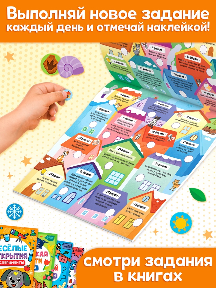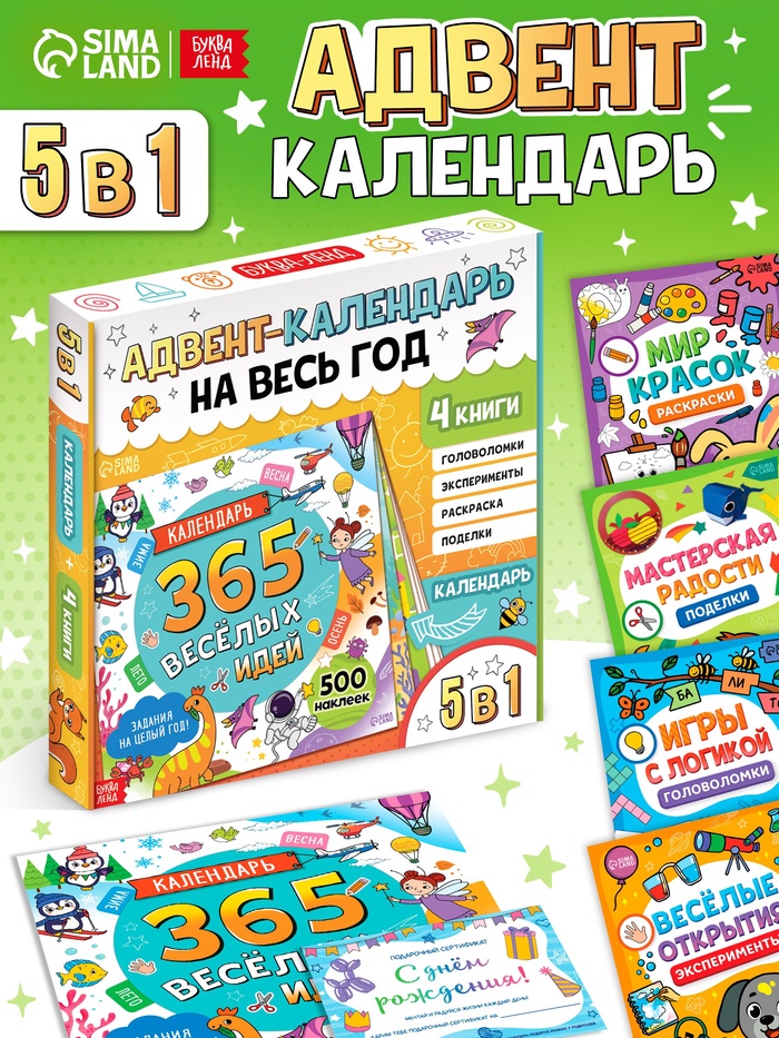 Годовой адвент-календарь для детей — это не просто счёт дней, а ежедневное приглашение к открытию: новое задание, новая наклейка, новая страничка в книгах. В комплекте — календарь на 365 дней, четыре творческие книги и сертификат на день рождения, всё упаковано в прочную картонную коробку. Подходит для детей от 3 лет, независимо от пола или повода.