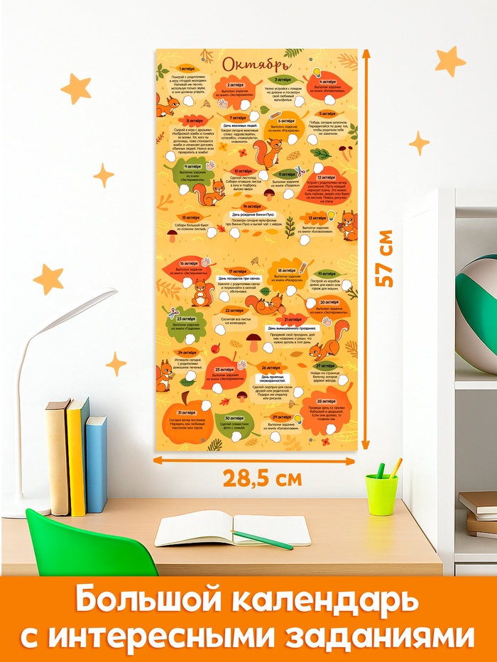 - Календарь с местом для наклеек — ребёнок отмечает каждый день, видя, как растёт его личная история года.