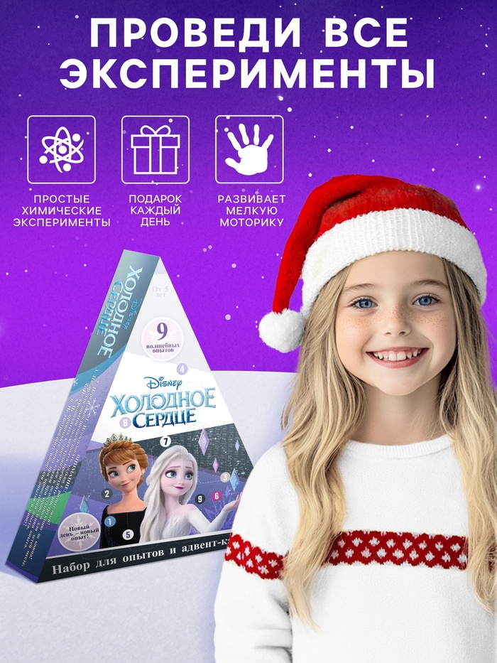 Адвент - календарь новогодний «Холодное сердце: Химические опыты», детский, 9 окошек с подарками: 9 опытов