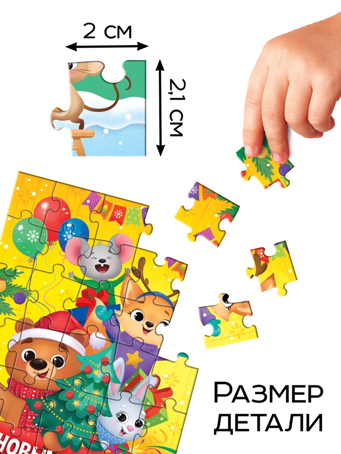 - В комплекте 8 пазлов и одна яркая игрушка, которая становится приятным дополнением к собранным картинам.
