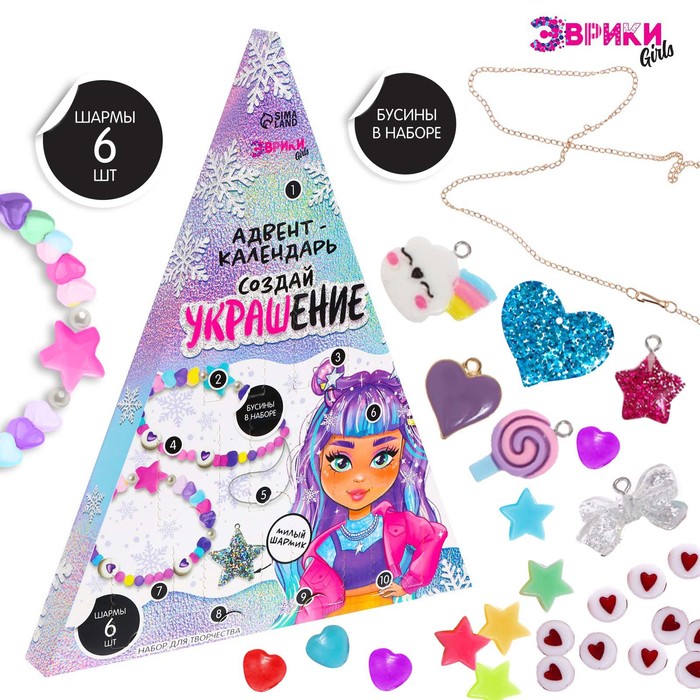 Адвент-календарь «Создай украшение» вдохновит на создание собственных маленьких шедевров! За 10 дней до Нового года открывайте по окошку и находите новые элементы для создания украшения. Внутри 6 шармов и множество других элементов для ваших изделий.