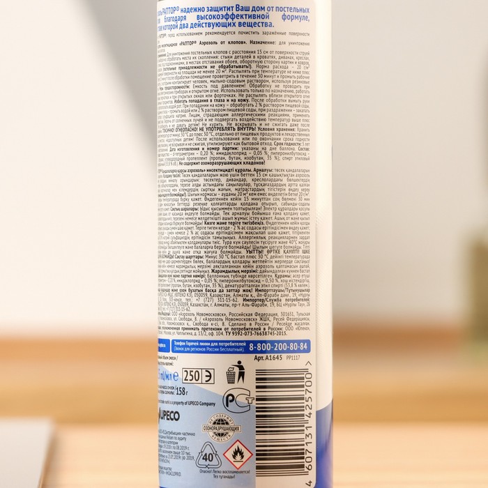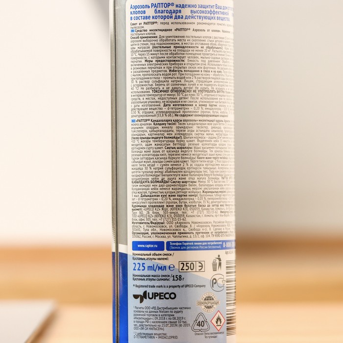 После распыления аэрозоля против клопов образуют капли, которые, попадая на насекомых, приводят к быстрому проникновению инсектицида в тело через хитиновый покров, убивая клопов за очень короткое время. Часть капель остается на обработанных аэрозолем РАПТОР поверхностях, по которым перемещаются клопы. Тем самым обеспечивается длительная защита помещения, поскольку насекомые контактируя с обработанной аэрозолем поверхностью становится носителями отравляющего вещества и через некоторое время погибают.