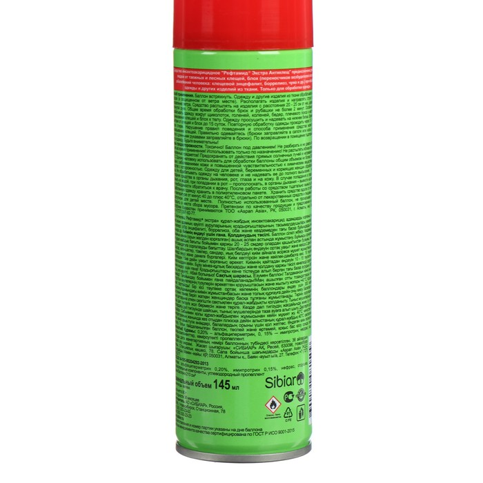 Меры предосторожности: нарушение правил поведения и способа применения средства может привести к присасыванию клещей. Одному человеку использовать для обработки баллоны общим объемом не более 300 мл в сутки. Не обрабатывать одежду на человеке и не надевать ее до полного высыхания. Огнеопасно!