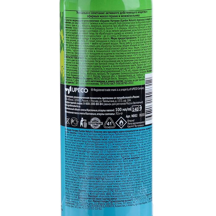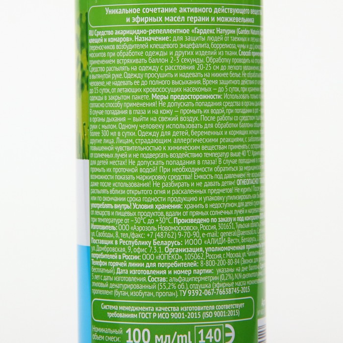 Состав: альфа-циперметрин, диэтилтолуамид, спирт этиловый денатурированный, триэтиленгликоль, отдушка (эфирные масла можжевельника и герани), пропеллент углеводородный (бутан, изобутан, пропан).