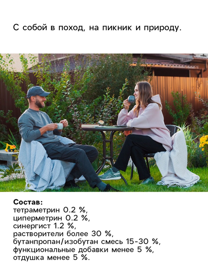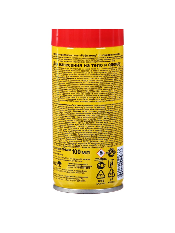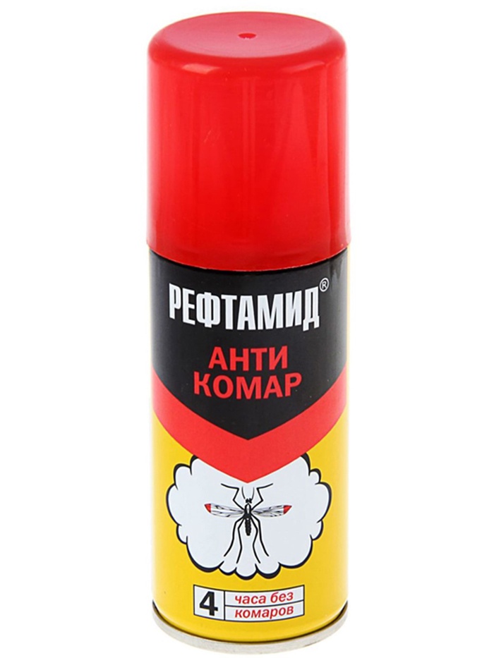ОписаниеРефтамид от комаров ''Антикомар'' предназначен для обработки открытых частей тела, одежды, а также занавесок, сеток на окнах и дверях с целью защиты от кровососущих насекомых: комаров, мокрецов, мошек и слепней. Содержит высокоэффективный действующий компонент и сохраняет своё действие в течение 4 часов. Средство наносится на одежду и открытые части тела. Надежно защищает от комаров и работает в любой местности, особенно на природе.Способ применения: перед использованием встряхните. Распыляйте средство на ладонь и наносите на открытые участки тела. Одежду обрабатывайте на открытом воздухе в защищённом от ветра месте с расстояния 20 ‒ 25 см. Для обработки одежды одному человеку использовать не более 1 баллона в сутки. Повторную обработку проводить не чаще чем через 3 – 5 суток.Меры предосторожности: берегите от детей. Храните средство вдали от источников огня. Не вдыхайте, не допускайте попадания в глаза и рот, а также на повреждённые участки кожи. При отравлении обратитесь к врачу. При попадании в глаза промойте их водой.Храните средство отдельно от пищи в местах, недоступных для детей, при температуре от 0 °C до + 30 °C и вдали от источников огня.СоставN,N-диэтил-м-толуамид (ДЭТА) 15,75%, диметилфталат 13,5%, бутан/пропан/изобутан смесь >30%, спирт этиловый денатурированный 15-30%, глицерин <5%, натрий тетраборнокислый <5%
