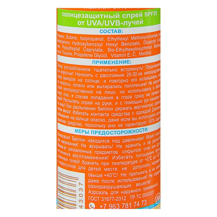 Спрей с антиоксидантным действием для защиты кожи от воздействия ультрафиолетового излучения. Защищает от появления солнечных ожогов, пигментных пятен, сухости кожи, фотостарения. Не оставляет белых следов и жирной липкой пленки. Аэрозоль не содержит озоноразрушающих веществ.Состав: Propane, Butane, Isopropanol, Ethylhexyl Methoxycinnamate, Diethylamino Hydroxybenzoyl Hexyl Benzoate, Dicaprylyl Carbonate, Propylheptyl Caprylate, Bis-Ethylhexyloxyphenol, Methoxyphenyl Triazine, Propylene Glycol, Vitamin E, C, Menthol.