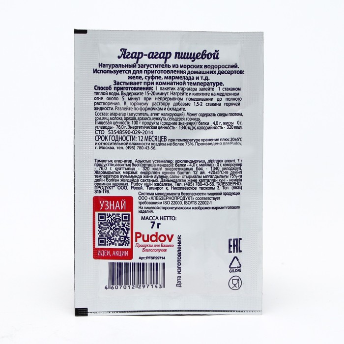Состав: агар-агар (пищевая добавка: загуститель, агент желирующий). Может содержать следы глютена, молока, сои, яиц, орехов, арахиса, кунжута, сельдерея, горчицы.