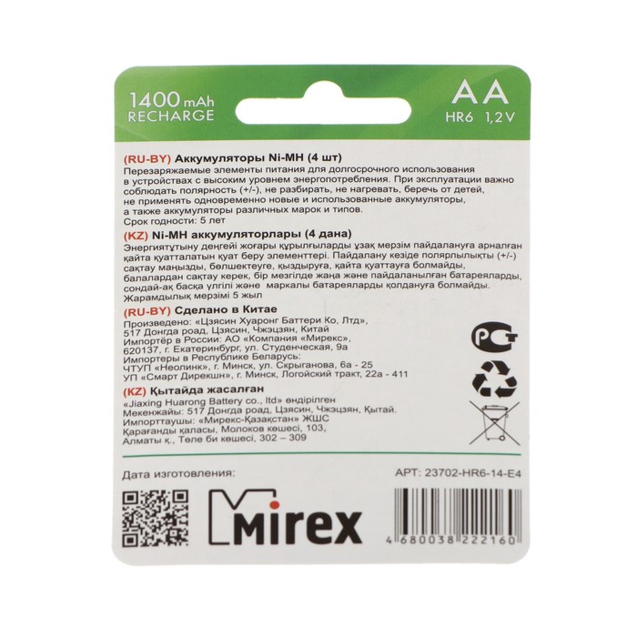 Аккумулятор Mirex Ni-Mh AA HR6-4BL — перезаряжаемые аккумуляторы для устройств, использующих батареи типа AA. Изготовлены с использованием технологии Ni-Mh (никель-металлогидрид), они обеспечивают стабильную работу в различных устройствах, таких как пульты ДУ, игрушки, радиоприемники и фотокамеры.