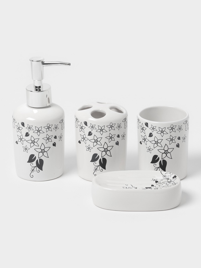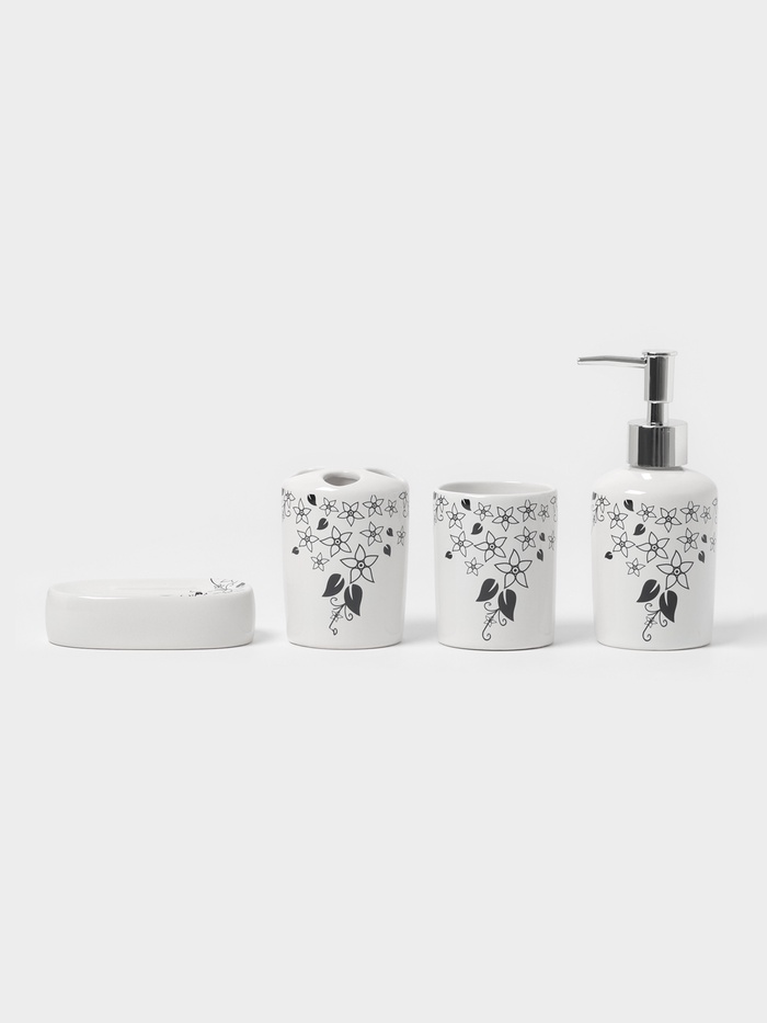 Набор аксессуаров организует пространство и станет стильным украшением Вашей ванной комнаты. За счет сдержанного дизайна данный керамический набор в ванную подойдет к любому дизайну ванной комнаты. Набор состоит из 4 предметов: 2 стакана, мыльница, дозатор.