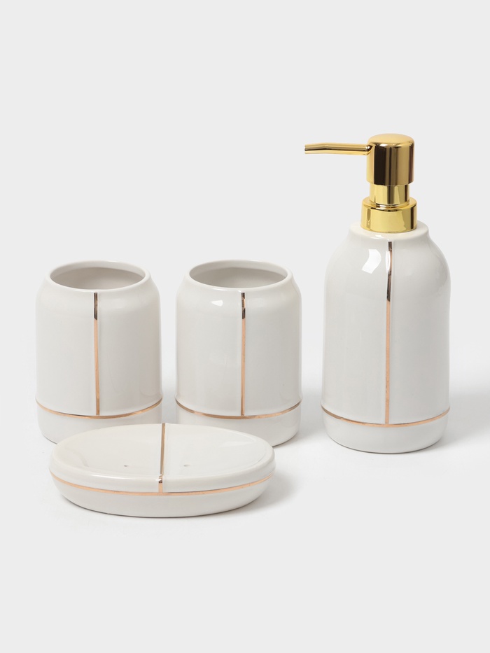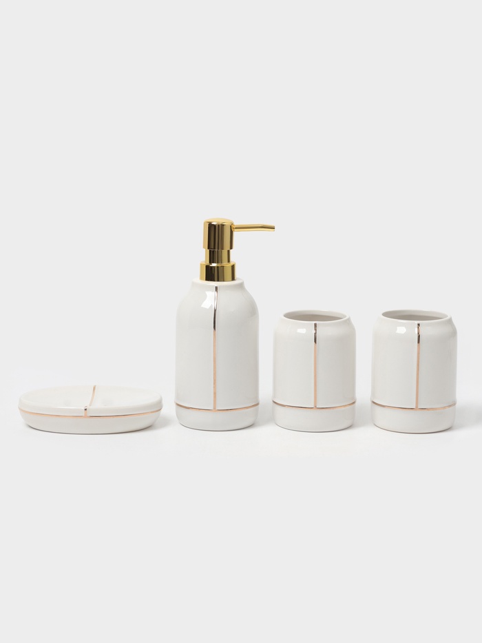 Набор аксессуаров организует пространство и станет стильным украшением Вашей ванной комнаты. За счет сдержанного дизайна данный керамический набор в ванную подойдет к любому дизайну ванной комнаты. Набор состоит из 4 предметов: 2 стакана, мыльница, дозатор.