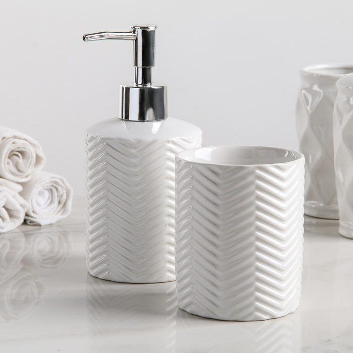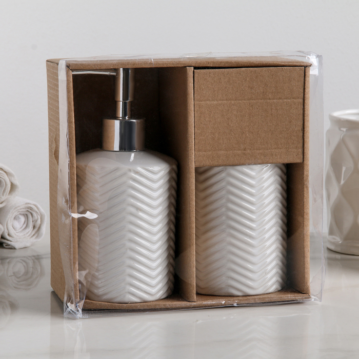 Набор аксессуаров организует пространство и станет стильным украшением Вашей ванной комнаты. За счет сдержанного дизайна данный керамический набор в ванную подойдет к любому дизайну ванной комнаты. Набор состоит из 2 предметов: дозатор, стакан.
