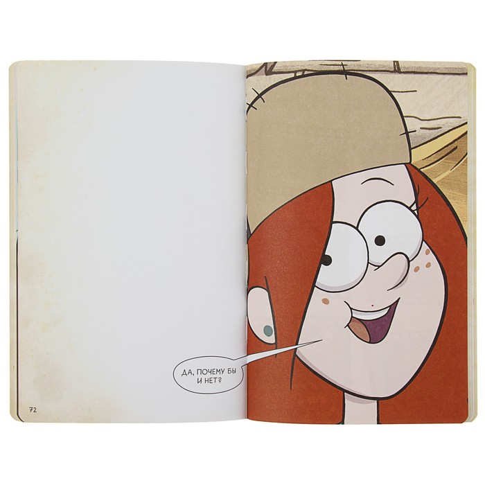 Это не просто блокнот — это целый мир развлечений вместе с любимыми героями Гравити Фолз: лабиринты, головоломки, раскраски и много страниц для своих заметок, рисунков и прочего. На каждой странице — герои сериала и их забавные фразочки.