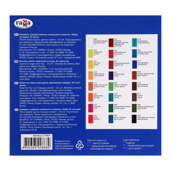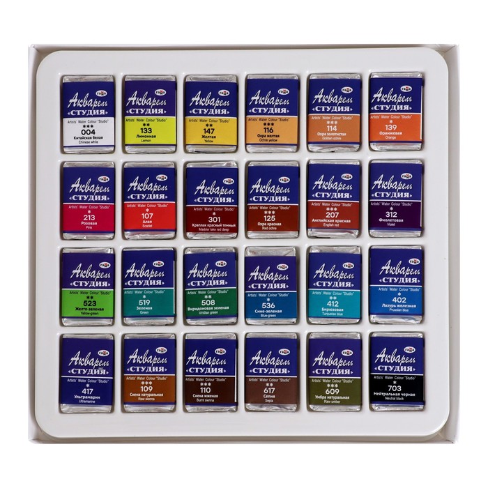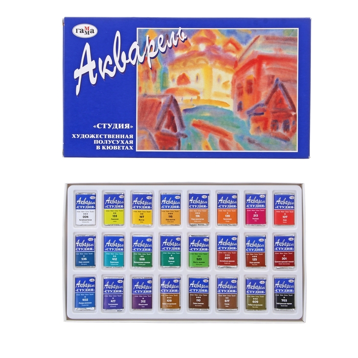 Сверхтонкие акварельные краски «Студия» на основе устойчивых пигментов. Яркие, насыщенные цвета, отличная светостойкость.