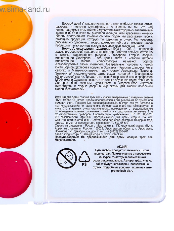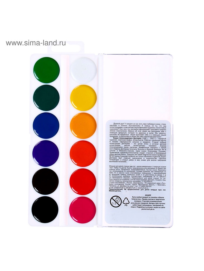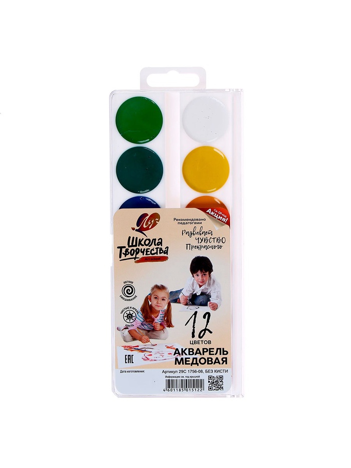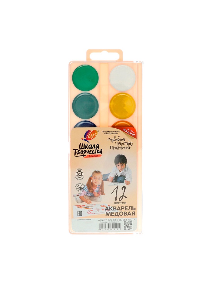 Медовая акварель изготовленная по классической рецептуре с яркими и чистыми цветами. Краска в подложке расположена группами: холодные-тёплые оттенки. Прекрасно размывается и разносится по поверхности бумаги, имея прозрачную основу без вкраплений. Краски смешиваются между собой, сохраняя насыщенность цвета. Краска легко смывается с рук и одежды.