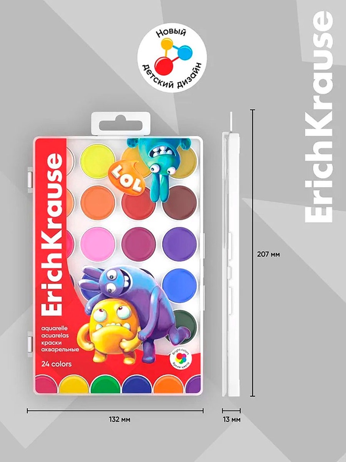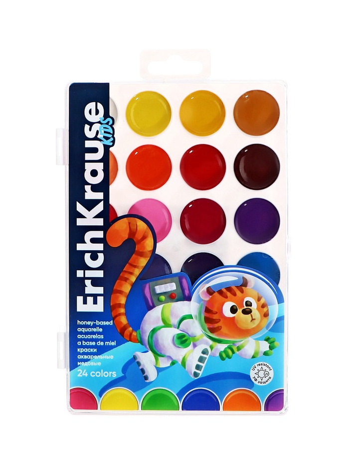 Акварель медовая ErichKrause «Jolly Friends», 24 цвета, УФ-фильтр, матовые насыщенные цвета, пластиковая коробка с европодвесом