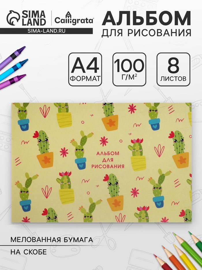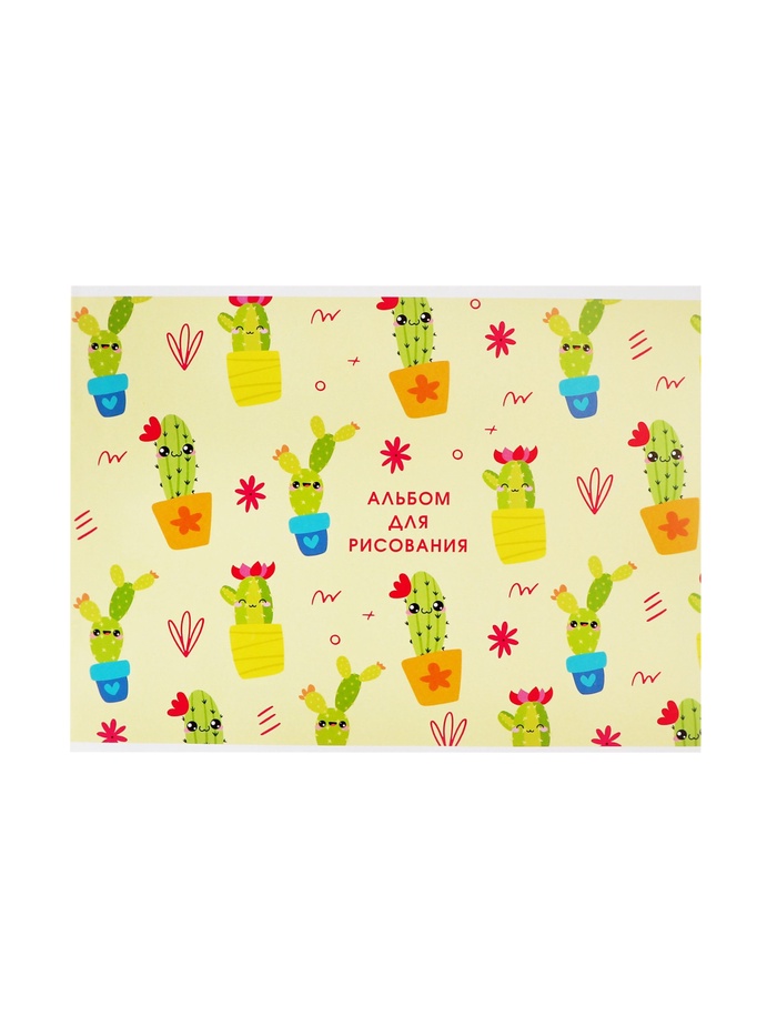 Альбом для рисования А4, 8 листов на скрепке "Кактусы", обложка мелованный картон, блок 100г/м2