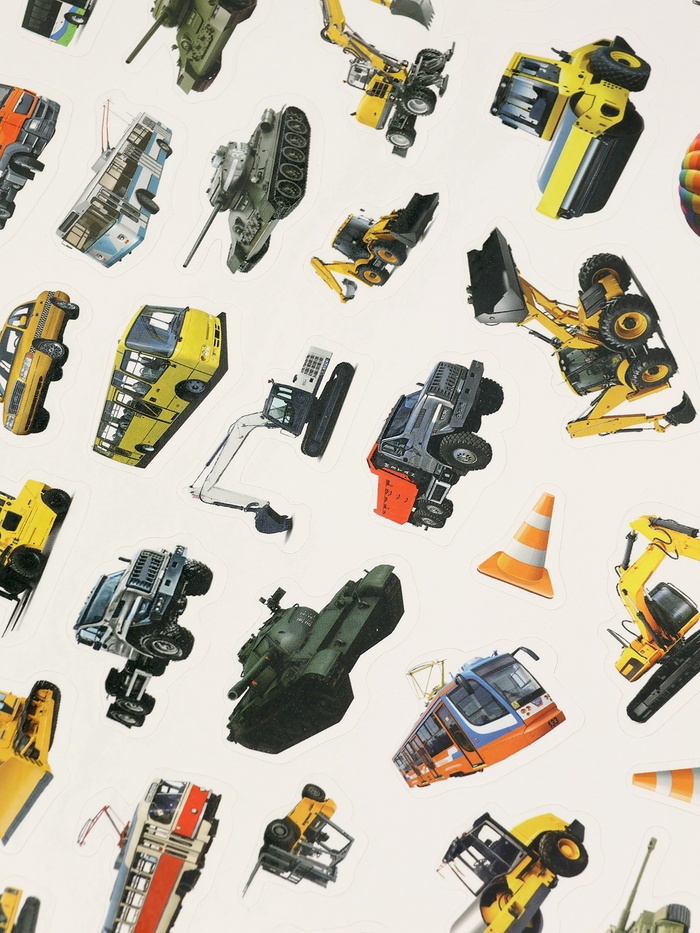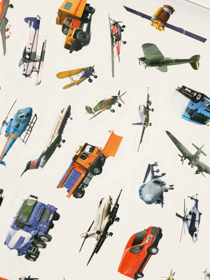 - 250 уникальных наклеек с изображениями автомобилей, самолётов, кораблей и других видов транспорта, которые легко комбинировать для создания собственных композиций.