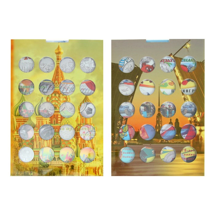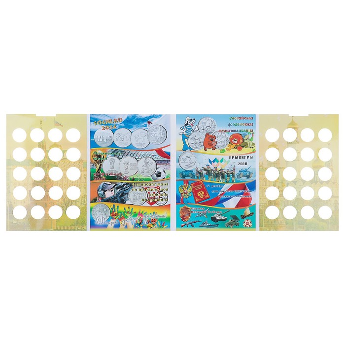 В альбоме-планшете для Вашего удобства отсутствуют подписи для монет, поэтому Вы можете поместить те монеты, которые захотите. Размер ячейки 27 мм - каждая монета плотно сидит в ячейке и не вываливается. Монеты видны с двух сторон.