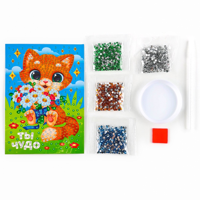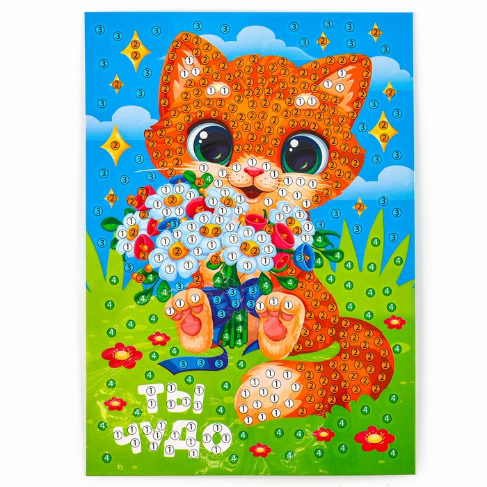 Чтобы получить сверкающую картинку, ребёнку предстоит разложить кристаллики специальным карандашом по схеме. Основа с клеевым покрытием будет надёжно удерживать стразы.