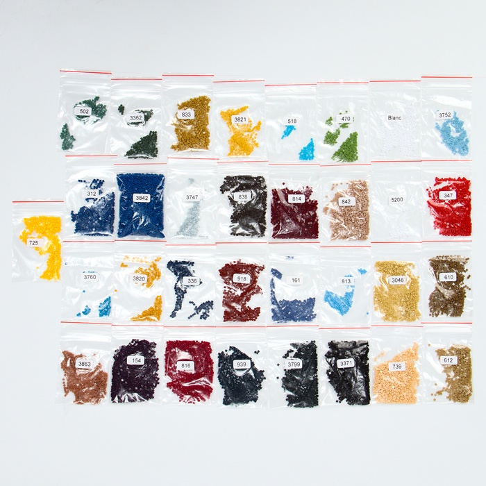 - Разложите кристаллики с помощью карандаша по указанной схеме, заполнив всё полотно. На картине уже обозначены необходимые оттенки. Холст с клеевым покрытием будет надёжно удерживать стразы.