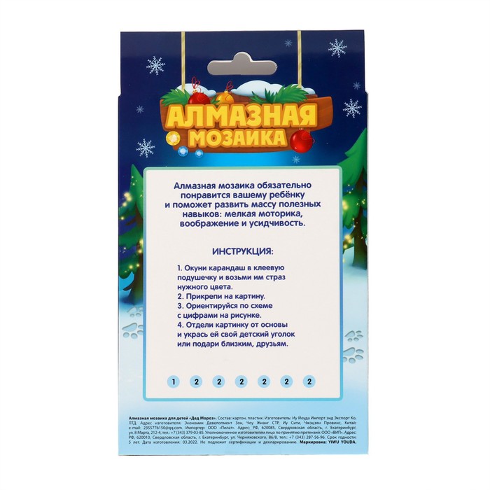 Ребёнку предстоит разложить кристаллики карандашом по пронумерованной схеме, полностью заполнив полотно. Основа с клеевым покрытием будет надёжно удерживать стразы. На ней уже обозначены необходимые оттенки, а цветовая таблица расположена на упаковке.