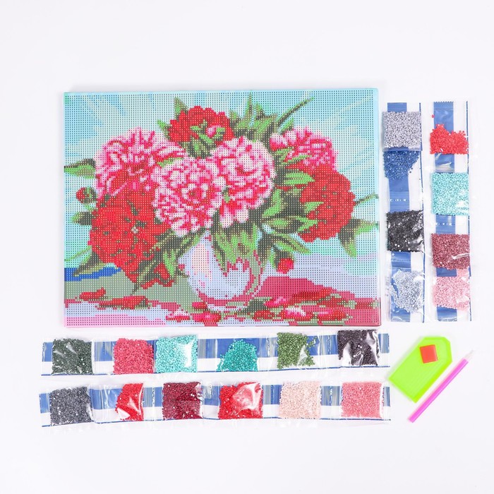 Разложите кристаллики с помощью карандаша по указанной схеме, заполнив всё полотно. На картине уже обозначены необходимые оттенки. Холст с клеевым покрытием будет надёжно удерживать стразы.