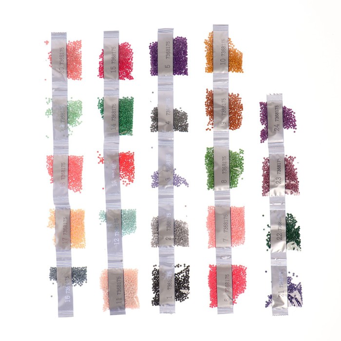 Разложите кристаллики с помощью карандаша по указанной схеме, заполнив всё полотно. На картине уже обозначены необходимые оттенки. Холст с клеевым покрытием будет надёжно удерживать стразы.