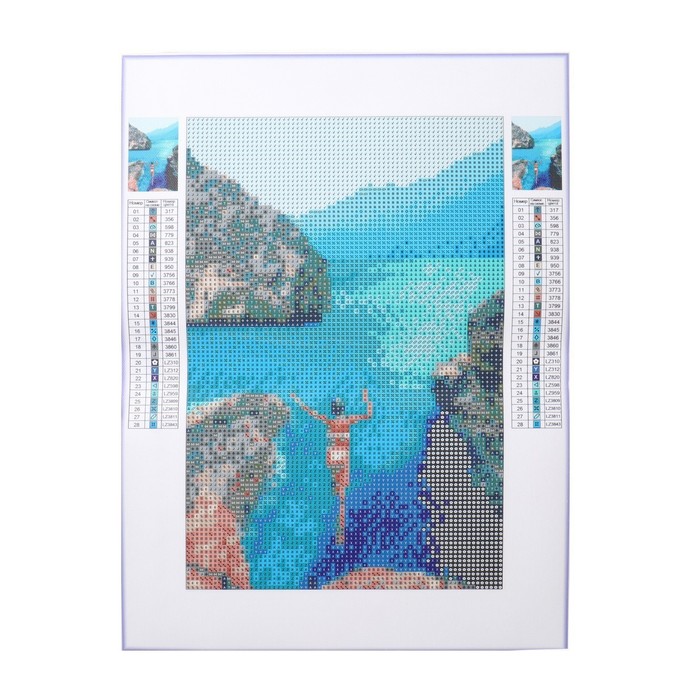 Разложите кристаллики с помощью карандаша по указанной схеме, заполнив полотно. На картине уже обозначены необходимые оттенки. Холст с клеевым покрытием будет надёжно удерживать стразы.