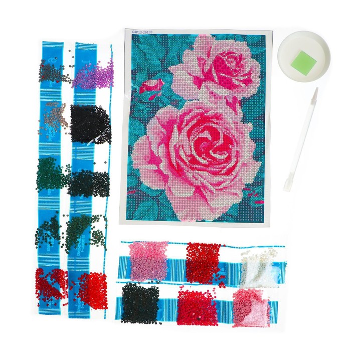 Разложите кристаллики с помощью карандаша по указанной схеме, заполнив полотно. На картине уже обозначены необходимые оттенки. Холст с клеевым покрытием будет надёжно удерживать стразы.