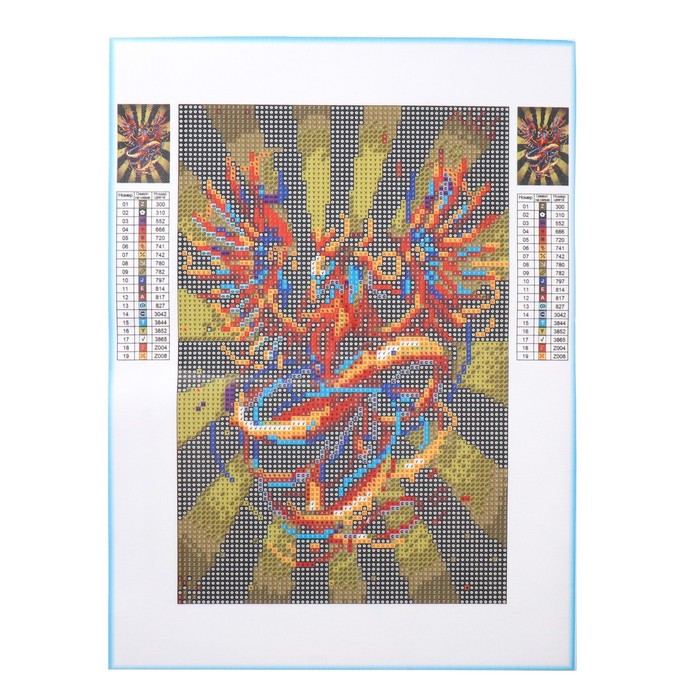 Разложите кристаллики с помощью карандаша по указанной схеме, заполнив полотно. На картине уже обозначены необходимые оттенки. Холст с клеевым покрытием будет надёжно удерживать стразы.