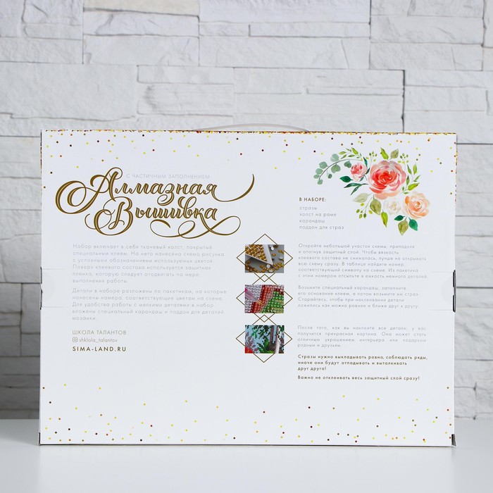 Часть картины предстоит заполнить стразами, другая часть напечатана на холсте-основе — такое изделие легче и быстрее создать. Поэтому набор подойдёт для тех, кто впервые пробует свои силы в этой технике или любит быстро добиваться результата.