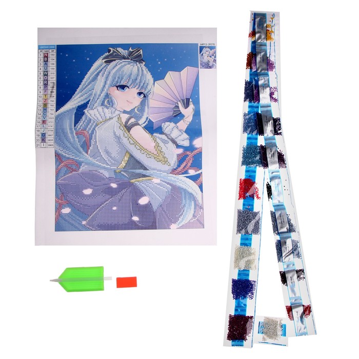 Разложите кристаллики с помощью карандаша по указанной схеме, заполнив полотно. Картонная основа с клеевым покрытием будет надёжно удерживать стразы. На картине уже обозначены необходимые оттенки.