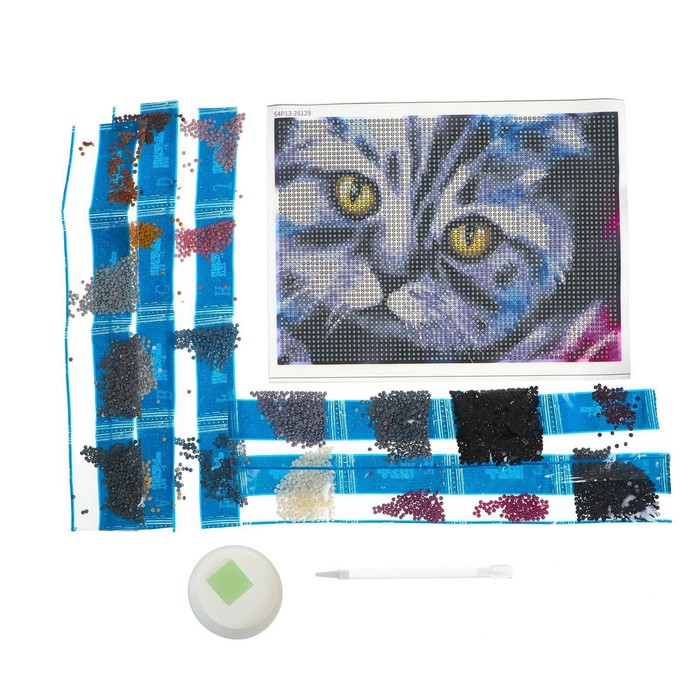 Разложите кристаллики с помощью карандаша по указанной схеме, заполнив полотно. На картине уже обозначены необходимые оттенки. Холст с клеевым покрытием будет надёжно удерживать стразы.