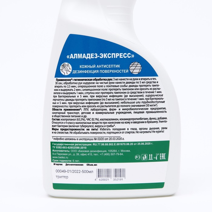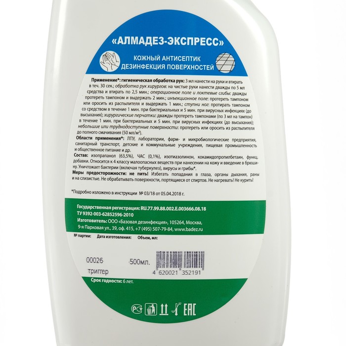 Состав: В качестве действующих веществ содержит: изопропиловый спирт (2-пропанол) — 63,5% и алкилдиметилбензиламмоний хлорид — 0,1%, а также функциональные добавки.