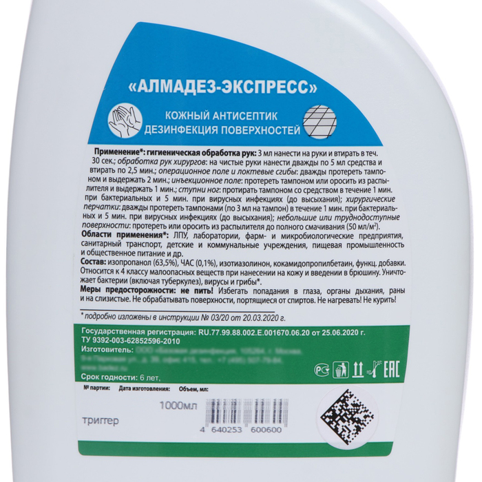 Состав: В качестве действующих веществ содержит: изопропиловый спирт (2-пропанол) — 63,5% и алкилдиметилбензиламмоний хлорид — 0,1%, а также функциональные добавки.