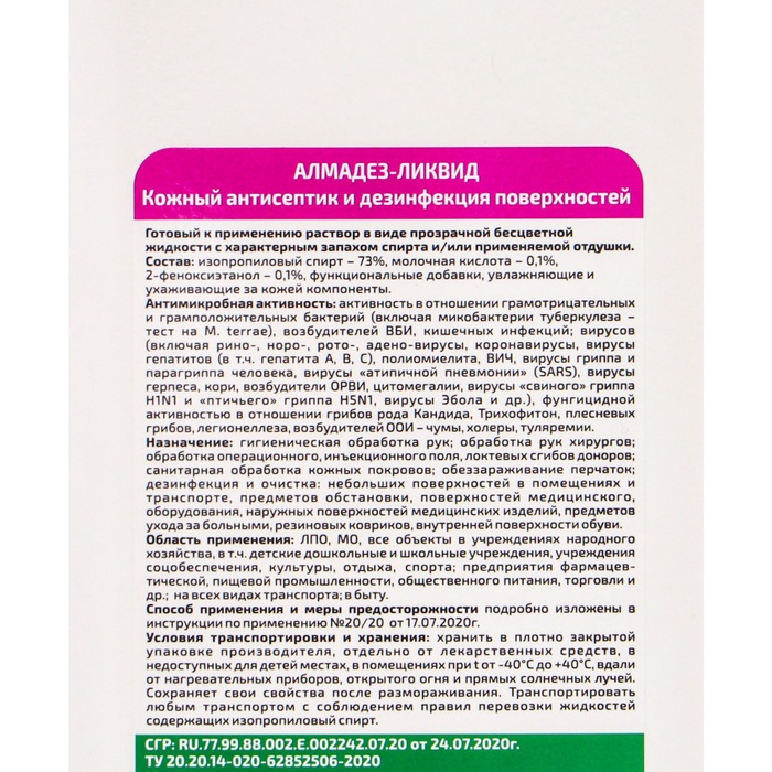 - Может использоваться для пропитывания на месте сухих салфеток, помещенных в Диспенсерную систему «Алмадез», и дальнейшего применения их для очистки и дезинфекции поверхностей методом протирания согласно утверждённой инструкции по применению.
