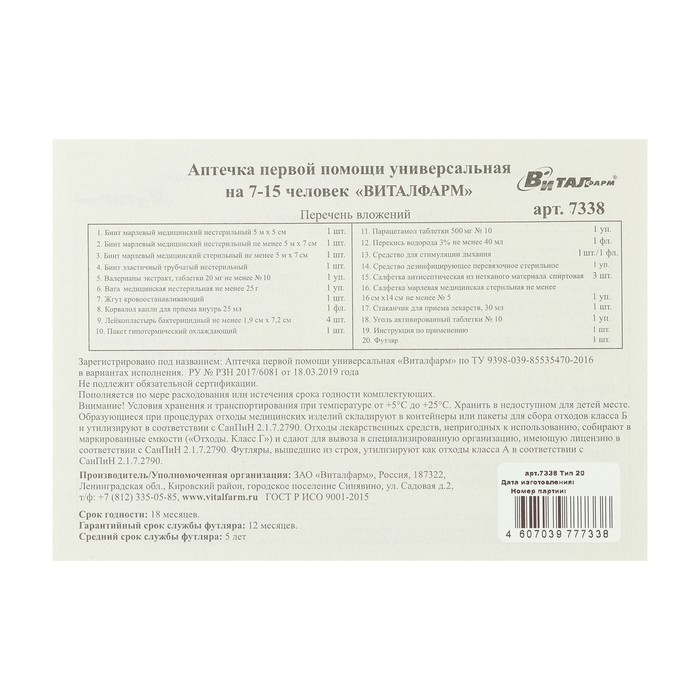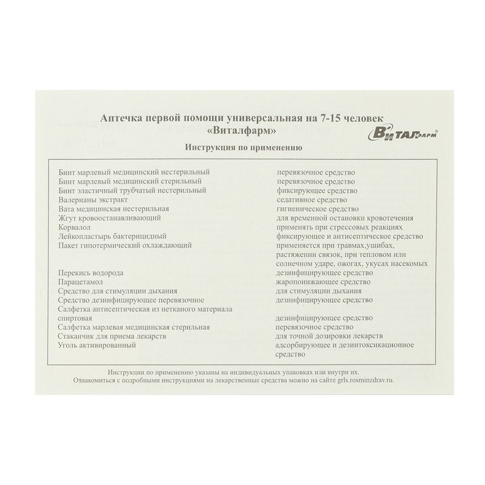 Аптечка предназначена для оказания первой помощи на предприятиях (производствах и офисах), в быту, на отдыхе. Для коллектива 7-15 человек.
