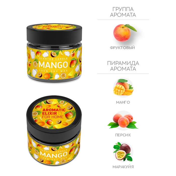 Сочетая в себе верхние ноты манго с сердцем из персика и мандарина, дополненными базовыми нотами маракуйи, создается сладкий, но терпкий аромат, который наполнит ваше пространство свежестью и тропическим настроением.