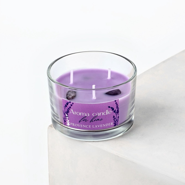 Свеча выполнена в нежно-фиолетовых тонах и украшена натуральными камнями лаванды, которые создают уютную атмосферу.