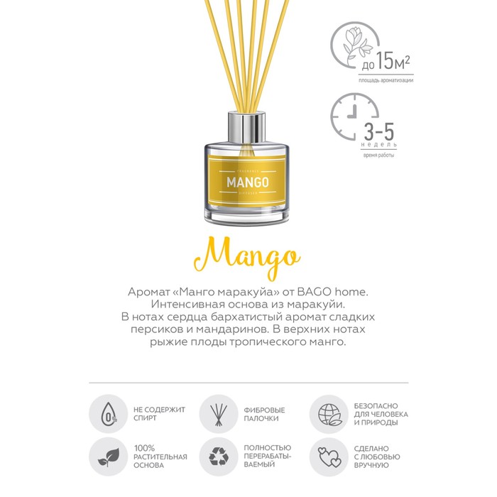 Сочетая в себе верхние ноты манго с сердцем из персика и мандарина, дополненными базовыми нотами маракуйи, диффузор создает сладкий, но терпкий аромат, который наполнит ваше пространство свежестью и тропическим настроением.