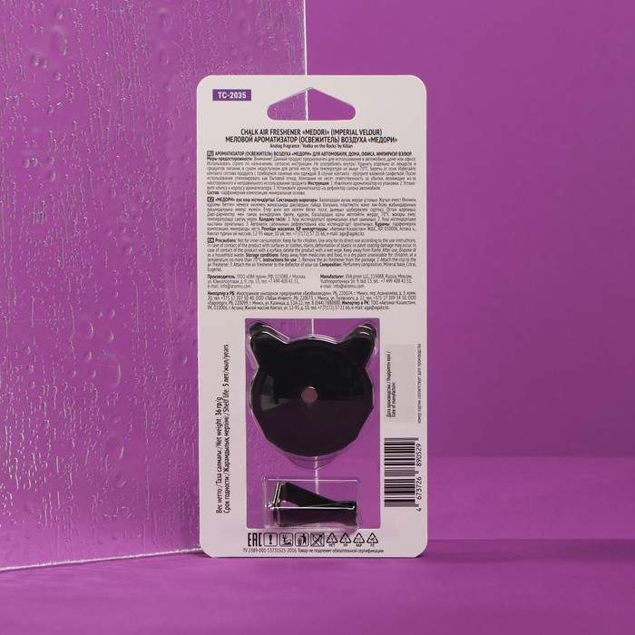 Imperial Velour верхние ноты: лайм, кардамон, зеленый лемон, в сердце: ирис, зеленый чай, кориандр, розовый перец, базовые ноты: мох, амбра, диптерикс душистый. Благодаря меловой технологии передает все ноты композиции без искажения, отдает аромат даже в самый сильный мороз, а в жару имеет более длительный срок использования до 45 дней, в отличие от других видов ароматизаторов. Imperial Velour аналог аромата (BY KILIAN - VODKA ON THE ROCKS)