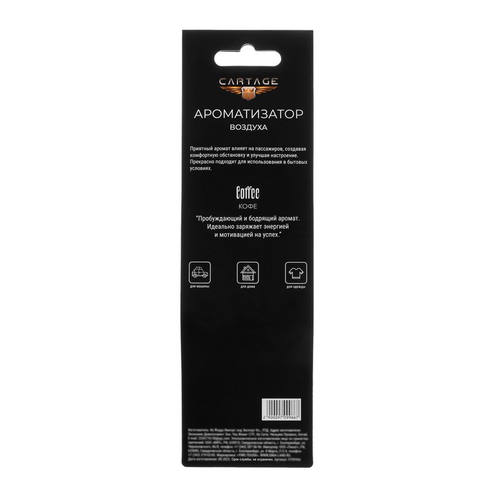 Антитабачная формула ароматизатора эффективно справляется с запахами табака и дыма, делая воздух в автомобиле чистым и свежим. Благодаря особой технологии производства, ароматизатор Cartage “Кофе” быстро и эффективно удаляет неприятные запахи, обеспечивая комфортное пребывание в автомобиле.