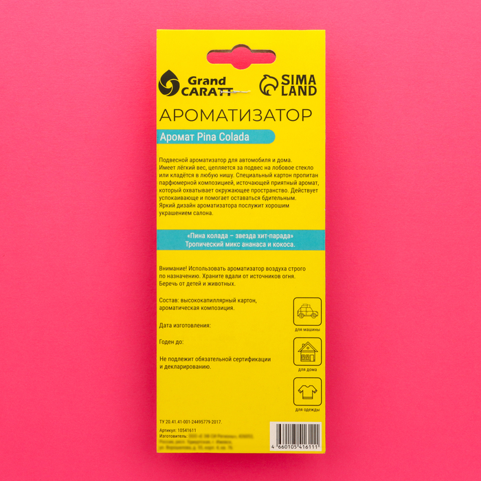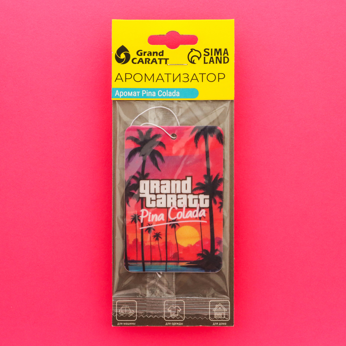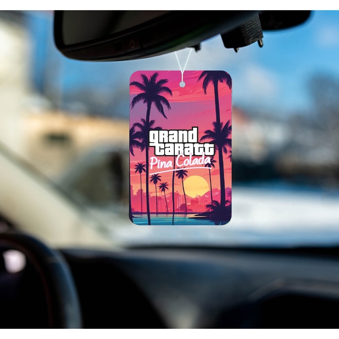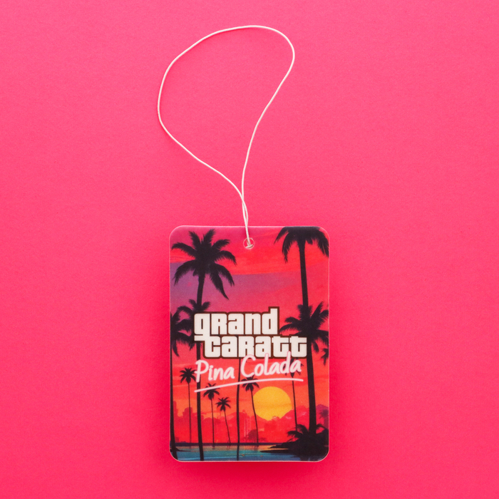 Автомобильный ароматизатор Grand Caratt "Пина Колада" в стиле той самой игры представляет собой подвеску из высококапиллярного картона, пропитанного качественной ароматической композицией. Он эффективно устраняет запахи бензина и табака и наполняет салон автомобиля лёгким ароматом ананаса и кокоса, характерным для коктейля "Пина Колада".